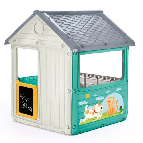 Nádherný barevný zahradní domeček. Dětský domeček bude skvělou zábavou dětem nejen na zahradě. Domeček má okna a dveře. Na otevíracích dvěřich je z vnější strany umístěna psací deska. A dobrodružství může začít! Vhodný pro vnitřní i venkovní použití. Vyrobeno z kvalitního a odolného materiálu. Jednoduchá montáž. Věk: 24m+. Rozměr: 125 x 100 x 104 cm. Balení: 93x101x18,5cm. Váha: 14kg.
