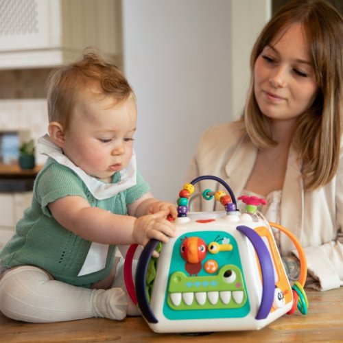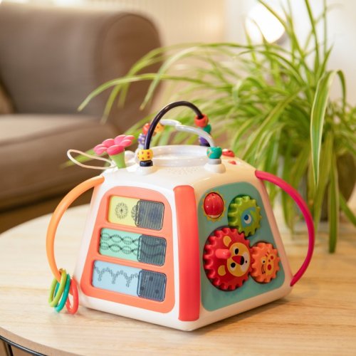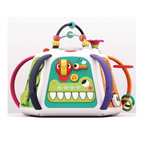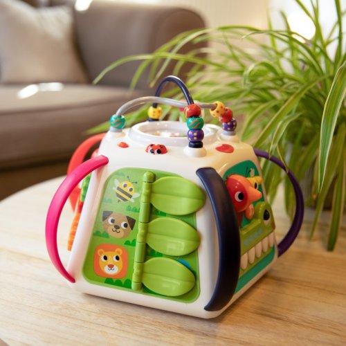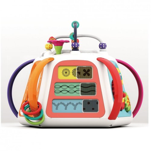 • plastová pyramida s mnoha aktivitami - labyrint s korálky, zrcátko, kreslící tabulka, ozubená kolečka, úchyty s LED osvětlením, hudební tlačítka, rotující váleček s barevnými kuličkami, pohyblivé vzory, hra se zvířátky aj.
