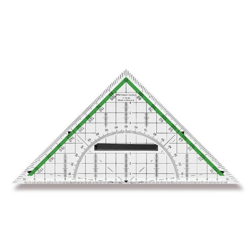 Technický trojúhelník pro rýsování a technické kreslení usnadňuje měření přímek, kolmic, úhlů, rovnoběžek a axonometrické kreslení. Milimetrová stupnice na přeponě, vždy 10 cm, od středu na obě strany s označením celého centimetru číslicí. Úhloměrová stupnice 0-180° na odvěsnách a oblouková úhloměrná stupnice 0 – 90° uprostřed přepony na obě strany., Stupnice s dělením po jednom stupni a označením každého desátého stupně číslicí. Příčné milimetrové stupnice kolmé na přeponu umožňující kreslení rovnoběžek s označením, každého pátého milimetru číslicí., * se sítí s měřítkem 10 mm, * průhledný systém, * antireflexní přesné provedení, * demontovatelná úchytka, * zkosení pro kreslení tuší, * délka stupnice 20 cm