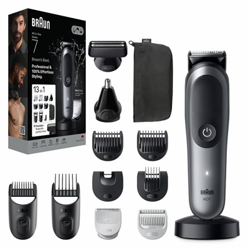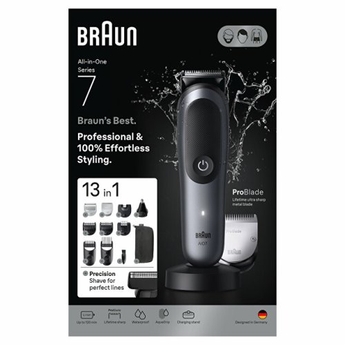 Braun Series 7 AIO7560 je profesionální sada na kompletní péči o tělo, vousy a vlasy. Nabízí 13 funkcí v jednom zařízení a je vybavena pokročilými technologiemi pro maximální přesnost, pohodlí i šetrnost. Ideální volba pro každodenní úpravu celého těla, včetně citlivých partií.