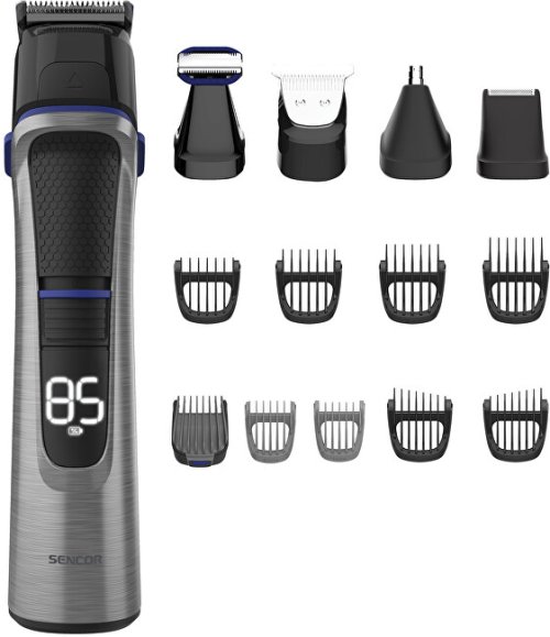 Multifunkční zastřihovač Sencor SHP 8500BK je ideální volbou pro komplexní péči o vzhled. Je vybaven nerezovými čepelemi a velmi tichým, výkonným profesionálním motorem, který si snadno poradí i s hustými vlasy a vousy. Díky ergonomické rukojeti přístroj skvěle padne do ruky a pohodlně se ovládá. Součástí balení je 14 výměnných nástavců pro různé typy zastřihování – od vlasů, vousů a těla, až po nos a uši. Nechybí ani mikroholicí hlavice a různé hřebeny. Na jedno nabití vydrží až 60 minut provozu, přičemž plné dobití trvá jen 2 hodiny. Přístroj je voděodolný (IPX5), má přepínač zapnutí/vypnutí a ukrývá vestavěnou Li-Ion baterii o kapacitě 1200 mAh. V příslušenství najdete mimo jiné i mazací olej, čisticí kartáček, nabíjecí USB-C kabel a praktický dlouhý hřeben.