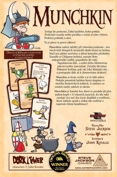 Sestup do podzemí a zabij každého, koho potkáš. Probodni zezadu svého parťáka a vezmi si jeho výbavu. Posbírej poklady a uteč! To je přece ta pravá zábava... Munchkin je karetní hra, které se prodalo již přeš milion kopií v 15 různých jazycích. Ke hře také existují nejrůznější rozšíření, které můžete spojit a získat tak naprosto šílené kombinace!