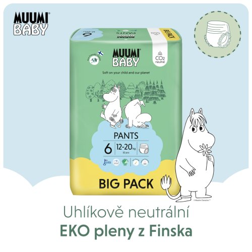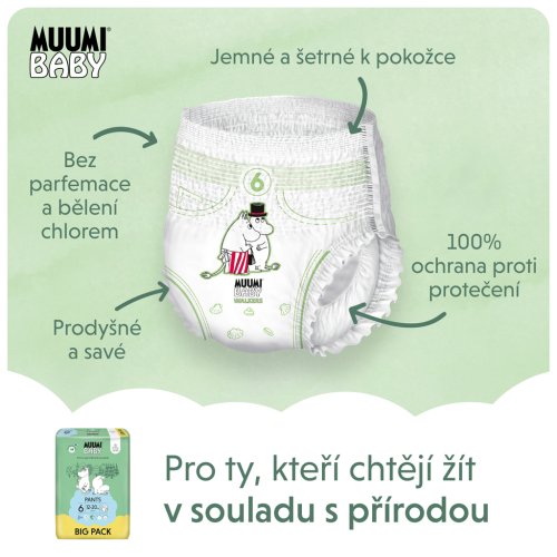 Plenkové eko kalhotky Muumi Baby Pants jsou určeny pro aktivní děti, které se už učí chodit. Jsou extrémně savé a díky pružnému materiálu perfektně drží i při zvýšeném pohybu, takže poskytují 100% ochranu proti protečení. Snadno se nasazují a stejně snadno se po rozepnutí i sundávají. Prodyšný materiál z čistých a měkkých rostlinných vláken udržuje pokožku děťátka suchou a zdravou během dne i noci. Plenky jsou hypoalergenní, vyrobené z čisté celulózy pocházející z finských lesů a s certifikací FSC. Ta je bělena pouze kyslíkem, a proto jsou plenky vhodné i pro tu nejcitlivější pokožku.