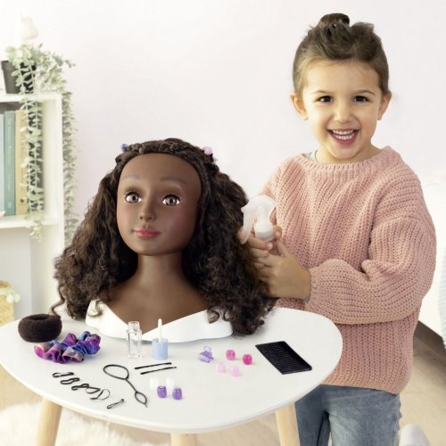Česací hlava pro vytváření trendy účesů. S magickou funkcí, použij přiložený štěteček na rty namočený do studené vody a rty se krásně vybarví. Obsahuje 23 ks doplňků, které můžeš uschovat v tajné skrýši v podstavci hlavy. Vybaveno přísavkami na spodní části podstavce pro lepší stabilitu. Výška hlavy 26 cm.