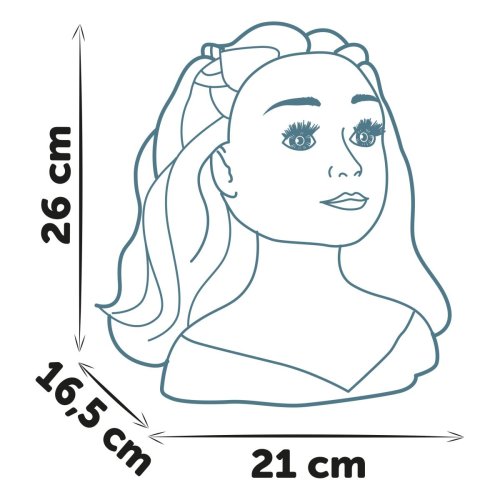 Česací hlava pro vytváření trendy účesů. S magickou funkcí, použij přiložený štěteček na rty namočený do studené vody a rty se krásně vybarví. Obsahuje 19 ks doplňků, které můžeš uschovat v tajné skrýši v podstavci hlavy. Vybaveno přísavkami na spodní části podstavce pro lepší stabilitu. Výška hlavy 26 cm.