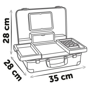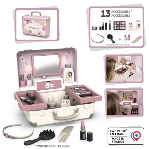 Kosmetický kufřík My Beauty je naplněn vším, co je potřeba pro skvělé mobilní wellness, ať už jde o účes, nehtový salon nebo make-up. Všech 13 doplňků (atrapy kosmetiky ke hraní) najdete uvnitř kufříku s rukojetí, který lze vzít kamkoli: 2 laky na nehty, 2 rtěnky, paleta očních stínů, řasenka, hřeben, čelenka, prsten a různé lahvičky. Díky možnosti zamčení se na cestě z kufříku nic neztratí. Navíc má zrcadlo a tajnou přihrádku. Police uvnitř lze sklopit, pro vytvoření prostoru pro další kosmetiku. Rozměry produktu (DxŠxV): 28 x 35 x 28 cm.