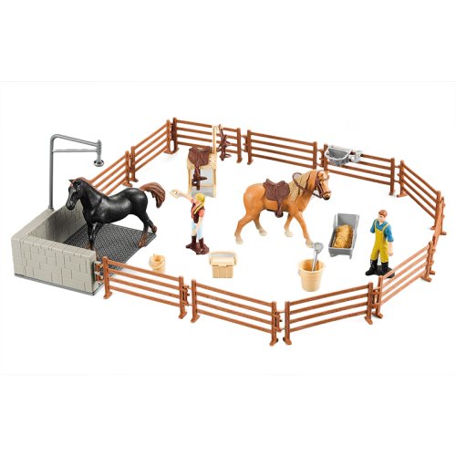 Co takhle si postavit vlastní výběh s ohradou pro koně? S touto sadou máš ideální příležitost, k dispozici dostaneš oplocení, mycí kout pro koně a je jen na tobě, jakou velikost a tvar bude mít tvůj výběh. V balení najdeš i postavičky koně, ošetřovatelů a další doplňky.