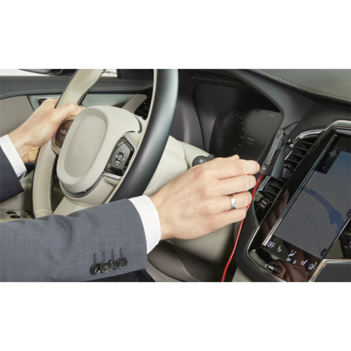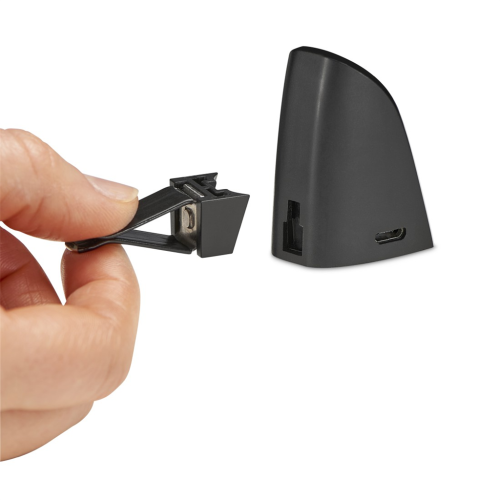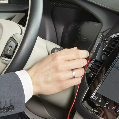 nabíjecí stojánek je možno položit na stůl v kanceláři, nebo jej pomocí svorky připevnit na lamely ventilační mřížky ve vozidle