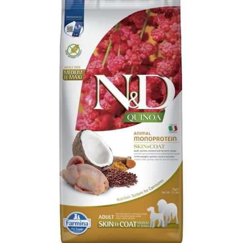 Vyvážené funkční krmivo pro dospělé psy středně velkých a velkých plemen při nežádoucí reakci na potravu pro navrácení a udržení zdraví kůže a srsti. Hlavním zdrojem vysoce kvalitních bílkovin v krmivu je hypoalergenní křepelka. Přidaná quinoa v bio kvalitě pěstovaná v Itálii podporuje trávení, absorpci živin a celkově zdraví trávicího traktu. Dále je bohatá na vzácné aminokyseliny a přírodní antioxidanty a má nízký glykemický index. Rybí olej zaručuje optimální poměr omega-3 a omega-6 mastných kyselin pro dobrou kondici kůže a srsti a její regenerační schopnost. Přídavek glukosaminu a chondroitinu vyživuje kloubní chrupavky, stimuluje růst a ochraňuje klouby. Krmivo neobsahuje obiloviny, geneticky modifikované suroviny, umělá barviva, bílkoviny ze sóji, hormonální ani antibiotická rezidua. Hlavní přednosti krmiva: