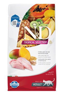 Kuře, špalda, oves a tropické ovoce. Kompletní krmivo pro dospělé kočky.