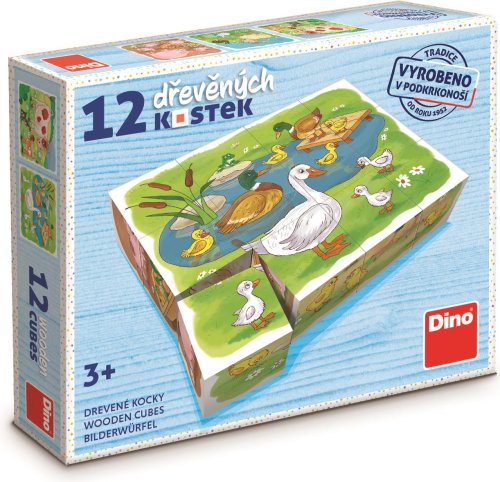 Dětské dřevěné kostičky, ze kterých lze sestavit 6 různých obrázků. Balení obsahuje 12 kostiček. Věk: 3+