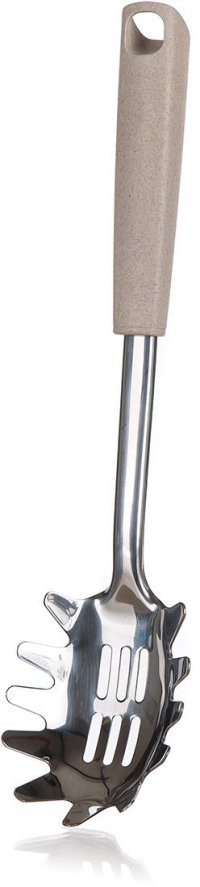 Naběračka na špagety NATURAL vyrobená z nerezové oceli, je určena pro profesionální i domácí použití. Naběračka je opatřena praktickým očkem pro možnost zavěšení, snadno se udržuje, lze mýt v myčce na nádobí. Řada kuchyňského náčiní NATURAL splňuje náročné požadavky profesionálů a je vhodná i pro domácí použití. Jednoduchý funkční design zabezpečuje nadčasovost a dlouhou morální i kvalitativní životnost všech výrobků. Držadlo je vyrobeno z polypropylenu a pšeničných otrub.