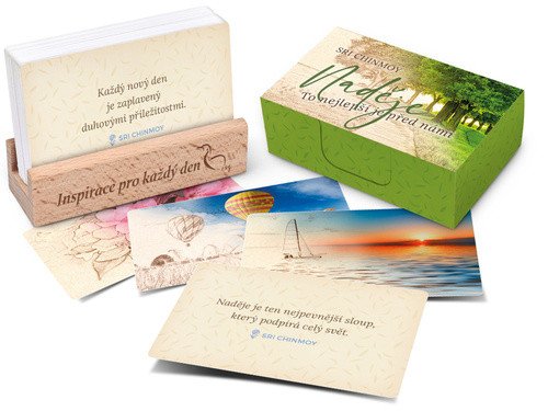 "Překážky přicházejí, jen aby zase odešly. Jsme tvůrci svého života, a proto zůstávejme pozitivní a optimističtí bez ohledu na to, co se právě děje. Pouštějme draka naděje a věřme, že TO NEJLEPŠÍ JE PŘED NÁMI. „Naděje“ je sada 55 aforismů pro život plný radosti a optimismu. Nechte se každý den inspirovat novou nadějí a novými příležitostmi. S krásným gravírovaným stojánkem ze dřeva, který slouží k vystavení kartiček."