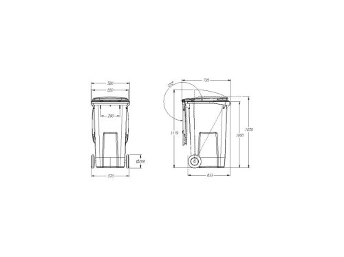Korpusy a víka kontejnerů jsou vyrobeny technologií vstřiku vysokohustotního polyetylenu, jsou jednobarevné a vyznačují se odolností vůči UV záření a vodě. Vysokohustotní polyetylen zajišťuje vynikající odolnost výrobku vůči účinku klimatických faktorů a změnám teploty. K výrobě kontejnerů jsou používány recyklovatelné materiály, přívětivé k životnímu prostředí. Použitá barviva neobsahují těžké kovy. Systém výsypu - DIN. Označení CE je deklarací výrobce, že hladina hluku vytvářeného kontejnerem je v souladu s požadavky směrnice Evropského parlamentu č. 2000/14/ES a činí 79,1 dB. Atest výrobku vystavila společnost TÜV Product Service GmbH v souladu s normou EN 840.