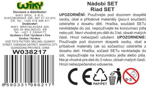 Nádobí plechové sada žlutá 15ks. Obsahuje tác 24cm, konvici 11cm, 2x hrneček 6cm, 4x talířek 5,5cm, 4x talířek 7cm.