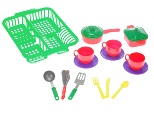 Nádobí s odkapávačem patří do kuchyňské výbavy každé malé hospodyňky. Hra v kuchyňce bude díky této barevné sadě mnohem zábavnější.