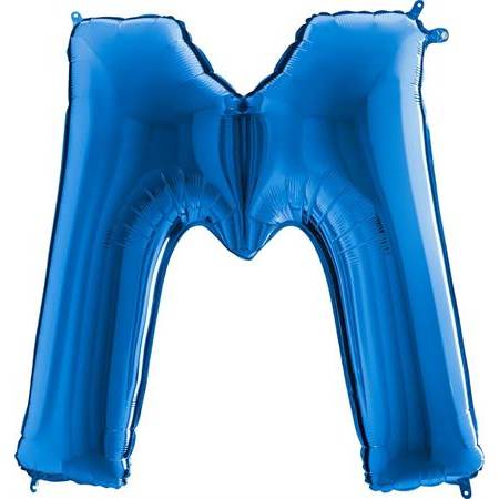 Modrý balónek písmeno M. Balónek je vyrobený z pevné fólie.