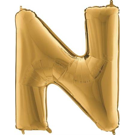 Zlatý balónek písmeno N. Balónek je vyrobený z pevné fólie.