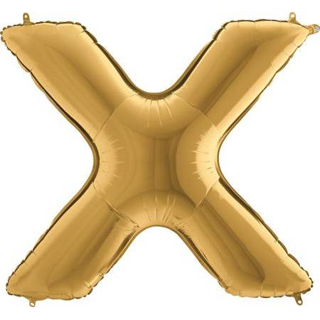 Zlatý balónek písmeno X. Balónek je vyrobený z pevné fólie.