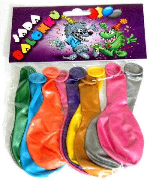 Balení obsahuje 10 kusů různobarevných metalízových nafukovacích balónků bez potisku.