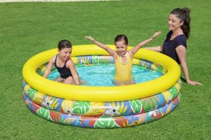 Nafukovací bazén Floral Paradise™ je určený především pro děti od 2 let a nabízí ideální místo pro letní zábavu a osvěžení. Bazén má oválný tvar s rozměry 168 cm na délku a průměrem 38 cm na výšku, což poskytuje dostatečný prostor pro několik dětí zároveň. Při naplnění pojme až 508 litrů vody, což zajišťuje příjemný zážitek z koupání. Po vyfouknutí má bazén průměr 157 cm, takže je snadno skladovatelný a přenosný.