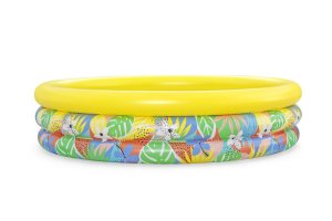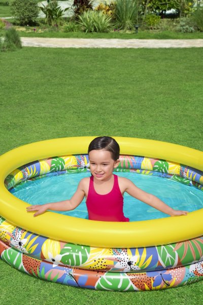 Bazén je vyroben z odolného PVC materiálu, který zajišťuje pevnost a dlouhou životnost. Konstrukce sestává ze tří nafukovacích komor, které jsou vybaveny bezpečnostními ventily pro snadné a bezpečné nafouknutí i vyfouknutí. Design bazénu je výrazný a veselý, s tropickým motivem listů a květin v jasných barvách – zelená, modrá, žlutá a oranžová – které přinášejí do každého dvora atmosféru tropického ráje. Vrchní prstenec je žlutý, což kontrastuje s barevným vzorem spodních dvou prstenců, a zajišťuje stabilitu a pevnost celé konstrukce.