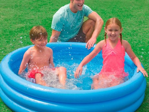 Větší dětský bazének modré barvy, šířka 168 cm a výška 38 cm. UPOZORNĚNÍ: Používat pouze ve vodě takové hloubky, kde dítě stačí, a pouze pod dohledem dospělé osoby.