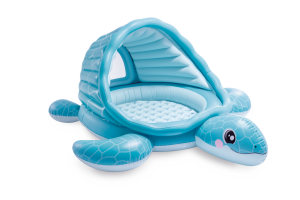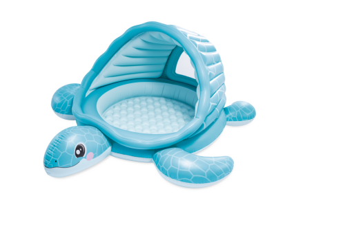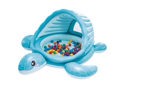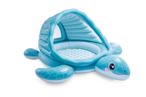 Bazén je vybaven měkkým nafukovacím dnem, které zajišťuje pohodlné posezení a zároveň ochranu před tvrdým povrchem. Vnitřní prostor bazénu je dostatečně prostorný, aby se v něm děti mohly volně pohybovat, a lze jej naplnit vodou nebo využít jako bazén na míčky. Součástí konstrukce je praktická stříška, která poskytuje částečný stín a chrání děti před přímým sluncem. Stříška je posazena na krunýři želvy a má z obou stran průhledná síťovaná okénka, která zajišťují dostatečné větrání a zároveň umožňují rodičům sledovat děti uvnitř.