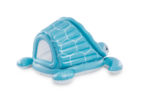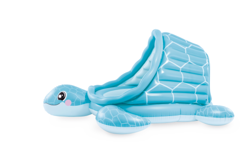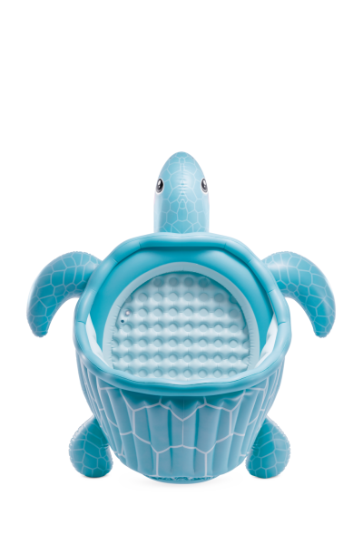 Nafukovací dětský bazén ve tvaru želvy je určený pro děti od dvou let a nabízí bezpečné a zábavné prostředí pro letní hry i odpočinek. Bazén je vyrobený z odolného, hladkého PVC materiálu v příjemné světle modré barvě s motivem želvího krunýře, který je znázorněn pomocí bílých vzorů na povrchu. Celkový design bazénu je přátelský a hravý, s velkou želví hlavou a ploutvemi, které přispívají k jeho atraktivnímu vzhledu.