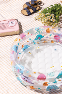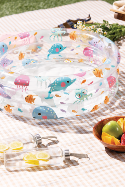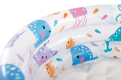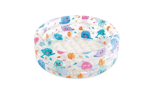 Nafukovací dětský bazének Malí mořští kamarádi pro děti od 1 do 3 let s měkkým nafukovacím dnem. Tří kruhový bazének pro miminka o velikosti 61 cm x 22 cm v designu malých dinosaurů. Kapacita vody do 14 cm výšky stěny. Opravná sada přiložena.