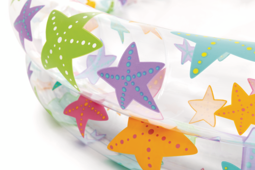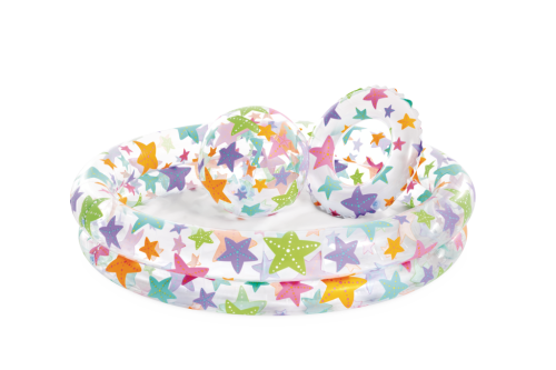 Bazénový set s motivem mořských hvězdic, je vodný pro děti od 3 let. Obsahuje nafukovací míč (51cm) a nafukovací kruh (51cm) a nafukovací bazén. Set je vyroben z kvalitního vinylu a opravná sada je součástí.