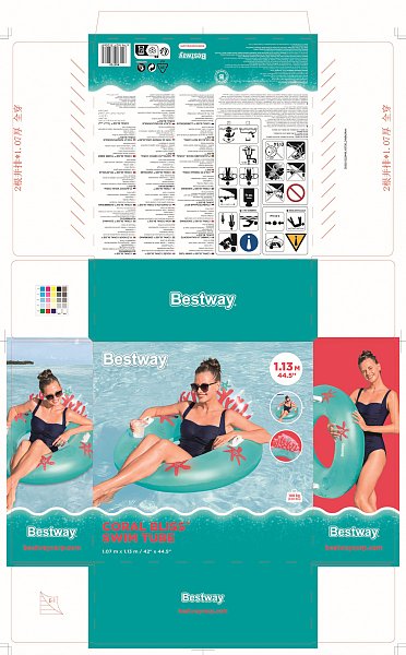 Bestway® Nafukovací kruh Coral Bliss™ umožní malým i větším plavcům užít si zábavu ve vodě. Vyrobený je z velmi kvalitního a odolného PVC materiálu a disponuje průměrem 113 cm. Kruh Bestway je vybaven opěradlem, madly a prostorem na láhev nebo plechovku s vaším oblíbeným pitím. Kruh má dvě vzduchové komory a jeho krásný design a pěkné oku lahodící barvy upoutají pozornost každého milovníka relaxace v moři či bazénu. Včetně opravné záplaty. Nenafouknutá velikost kruhu: Ø 113. Rozměry balení: 24 x 24 x 9 cm. Určeno pro 1 osobu. Maximální nosnost: 100 kg. Věk: 14+