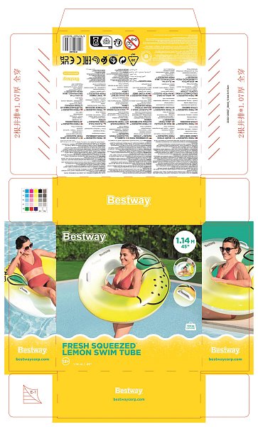 Bestway® Nafukovací kruh Fresh Squeezed™ Lemon umožní malým i větším plavcům užít si zábavu ve vodě. Vyrobený je z velmi kvalitního a odolného PVC materiálu a disponuje průměrem 114 cm. Plovací kruh Bestway je ideálním doplňkem pro vodní aktivity dětí i dospělých. Stačí si do něj sednout a nechat se unášet vodou. Kruh má jednu vzduchovou komoru, pojistné ventily a dvě madla. Včetně opravné záplaty. Nafouknutá velikost kruhu: Ø 99 x 31,5 cm. Nenafouknutá velikost kruhu: Ø 114. Rozměry balení: 19,8 x 19,8 x 6,5 cm. Určeno pro 1 osobu. Maximální nosnost: 100 kg. Věk: 12+