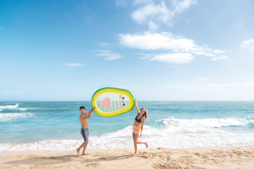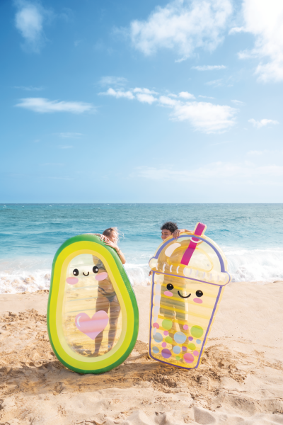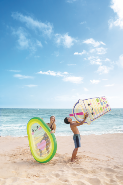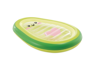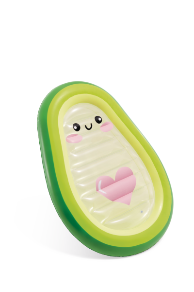 Nafukovací lehátko ve tvaru avokáda Avocado Buddy je originální letní doplněk určený pro relaxaci na vodní hladině. Jeho tvar je věrně inspirován avokádem, přičemž vnější okraj je tmavě zelený, přecházející do světlejší zelené a žluté barvy směrem k centru. Střed lehátka je průhledný a vybavený kreslenou tvářičkou s roztomilými očima, růžovými tvářemi a úsměvem, což dodává produktu hravý a přátelský vzhled. Na průhledné ploše je také výrazné růžové srdce, které přispívá k jeho estetické přitažlivosti.