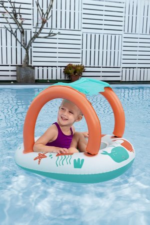 Stříška nad loďkou je vyrobena z lehkého nafukovacího materiálu v tyrkysové barvě a je upevněna na oranžových obloucích, které zároveň zajišťují stabilitu celé konstrukce. Stříška slouží jako sluneční clona, která efektivně blokuje UV záření a chrání jemnou dětskou pokožku před škodlivými slunečními paprsky. Díky suchému zipu lze stříšku snadno odejmout, což umožňuje přizpůsobení podle potřeb a počasí.