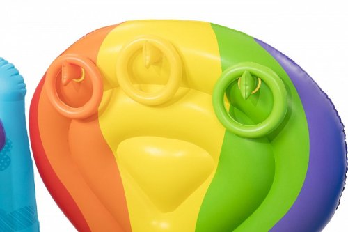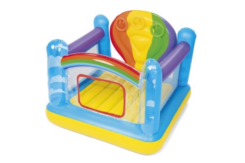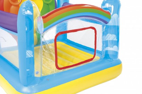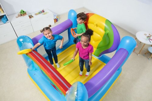 Nafukovací hrad skákací ve veselých duhových barvách. Velikost hradu je přibližně 1,75 m x 1,73 m x 1,37 m. Hrad můžete použít jak doma, tak venku. 3 nafukovací kroužky součástí balení. Opravná záplata součástí balení.