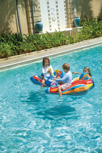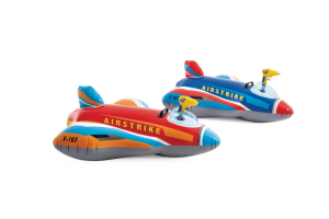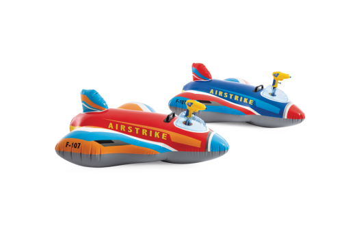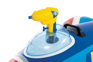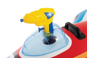 Hlavní atrakcí této nafukovací stíhačky je zabudovaná vodní pistolka umístěná v kokpitu letadla. Pistolka je žluté barvy a je umístěna tak, aby ji dítě mohlo snadno ovládat během hry. Vodní pistolka umožňuje střílení vodních proudů, což přidává další prvek zábavy a interakce s ostatními dětmi ve vodě. Nafukovací letadlo má také dostatečnou stabilitu díky svému tvaru s širokými křídly a zadním stabilizátorem, což umožňuje bezpečné a pohodlné používání v bazénech nebo na jiných vodních plochách.