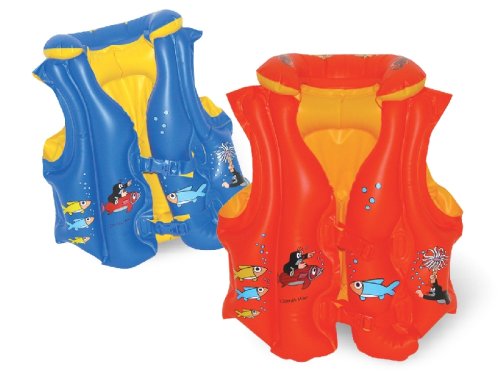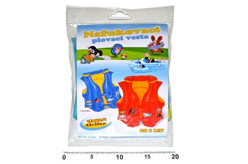 Dětská plavací vesta s motivy Krtečka a jeho kamarádů je skladná, bezpečná, snadno se nafukuje a vyfukuje. Je bez ftalátů a s bezpečnostními ventily. Děti mohou využít vestičku buď ke hře ve vodě nebo k výuce plavání. Vesta má nafukovací límce a nastavitelné přezky.
