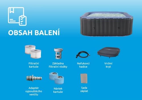 Poznámka: K vířivce nejde připojit solární ohřev, chlorinátor ani písková filtrace. Nedoporučujeme rovněž používání potahů filtračních kartuší.