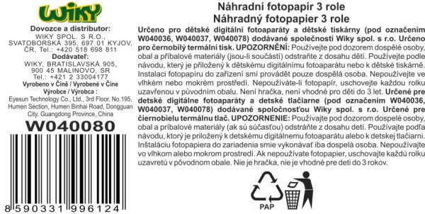 Náhradní fotopapír 3 role set. Určeno pro proložky W040036, W040037, W040078, W041994, W053025, W053026. Šířka fotopapíru 5,5 cm, tisknutelná šíře 4,8 cm.