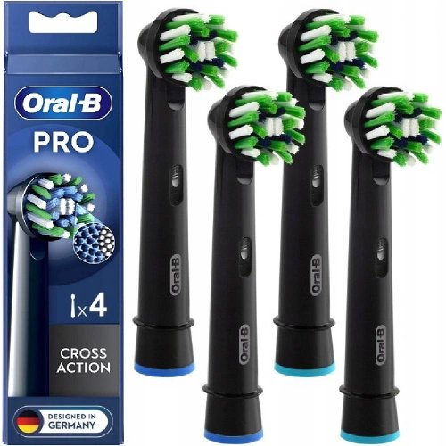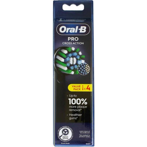 Kartáčková hlava Oral-B Pro Cross Action v černé barvě má více než 2200 dokonale zkosených vláken, která v porovnání s manuálním zubním kartáčkem odstraňují až o 100 % více bakteriálního zubního plaku a zajišťují čistší zuby a zdravější dásně. Originální kartáčkové hlavy Oral-B jsou navrženy s novými vlákny ve tvaru X, která čistí v místech, kam kulaté hlavy nedosáhnou. Ukazatel opotřebení kartáčkové hlavy změní vlákna ze zelené barvy na žlutou a ukazuje tak, kdy je hlavu nutné vyměnit pro 100% účinnost čištění. Zaručená kompatibilita se všemi dobíjecími zubními kartáčky Oral-B, s výjimkou zubních kartáčků Pulsonic a iO.