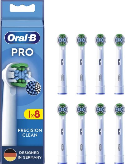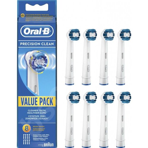 Kartáčková hlava Pro Precision Clean odstraňuje zubní plak a umožňuje tak v porovnání s běžným manuálním zubním kartáčkem špičkové čištění jednoho zubu po druhém. Originální kartáčkové hlavy Oral-B jsou navrženy s novými vlákny ve tvaru X, která čistí v místech, kam kulaté hlavy nedosáhnou. Ukazatel opotřebení kartáčkové hlavy změní vlákna ze zelené barvy na žlutou a ukazuje tak, kdy je hlavu nutné vyměnit pro 100% účinnost čištění. Zaručená kompatibilita se všemi dobíjecími zubními kartáčky Oral-B, s výjimkou zubních kartáčků Pulsonic a iO.