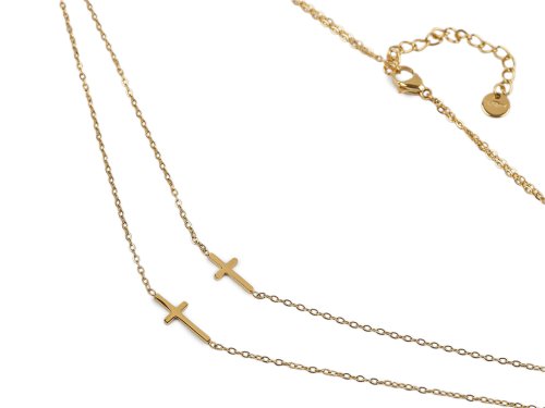 Dvojití náhrdelník s křížky je elegantním doplňkem, který zaujme svou jemností a rafinovaným designem. Lesklý povrch mu dodává luxusní vzhled, zatímco decentní křížky přináší symboliku a styl do každodenního outfitu. Zapíná se na karabinku. Díky adjustačnímu řetízku se snadno přizpůsobí vašemu krku, aby pokaždé perfektně seděl. Rozměry křížků jsou 6 x 12 mm a 6 x 15 mm.