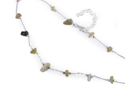 Jemný řetízkový náhrdelník z kvalitní nerezové oceli je ozdobený broušenými korálky a korálky syntetických minerálů. Hodí se k slavnostním šatům i na běžné nošení, má velice všestranné využití. Zapíná se na karabinku a prodlužovací řetízek.