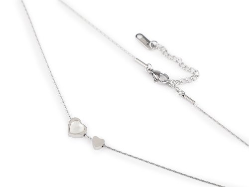 Náhrdelník s ozdobou srdíčka je vyrobený z kvalitní nerezové oceli. Je velice decentní, motiv srdíčka potěší všechny ženy. Je i nádherným dárkem pro blízkou osobu nebo na Valentýna. Náhrdelník č. 1 má hranatý hadí řetízek široký 1 mm, srdíčko je ozdobené poutavou imitací perleti. Je velké 10 x 11 mm, na náhrdelníku se volně pohybuje, ale nejde sundat. Náhrdelník č. 2 a 3 má jemný řetízek z hranatých oček široký 0,6 mm, větší srdíčko (8x8 mm) je ozdobené efektem kočičího oka, malé srdíčko (5x5 mm) má vysoký zrcadlový lesk. Obe srdíčka se na řetízku volně pohybují, z náhrdelníku nejdou sundat. Náhrdelníky se zapínají na karabinku s prodlužovacím řetízkem.