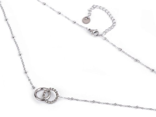 Řetízkový náhrdelník s přívěskem propojených kroužků je vyrobený z kvalitní nerezové oceli. Kroužky mají vysoký lesk, jsou umístěné uprostřed náhrdelníku. Řetízek je očkový, kombinovaný s drobnými nerezovými korálky. Náhrdelník decentně dozdobí většinu outfitů, zapíná se na karabinku s prodlužovacím řetízkem.