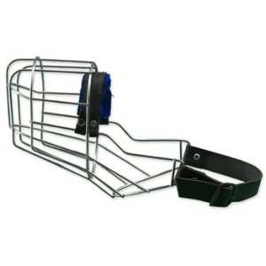 Kovový náhubek s koženými řemínky na zapínání.