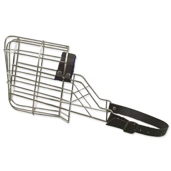Kovový náhubek s koženými řemínky na zapínání. Vhodný zejména pro feny německých ovčáků a podobná plemena.