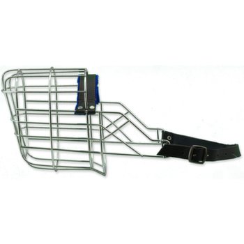 Kovový náhubek s koženými řemínky na zapínání.
