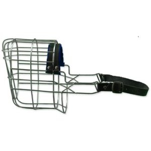 Kovový náhubek s koženými řemínky na zapínání.